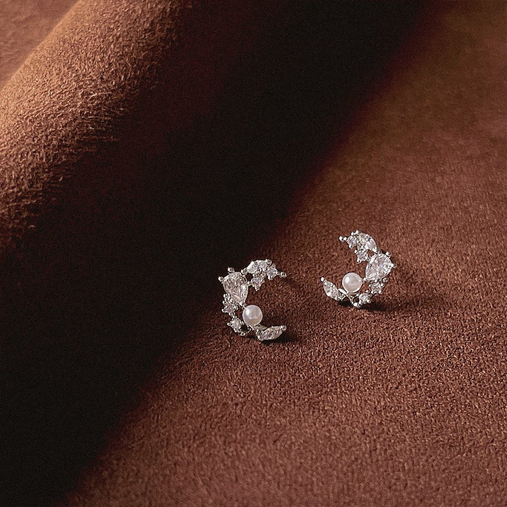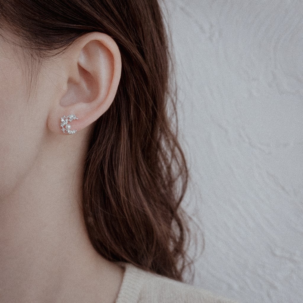三日月のフォルムにストーンとパールをあしらい、