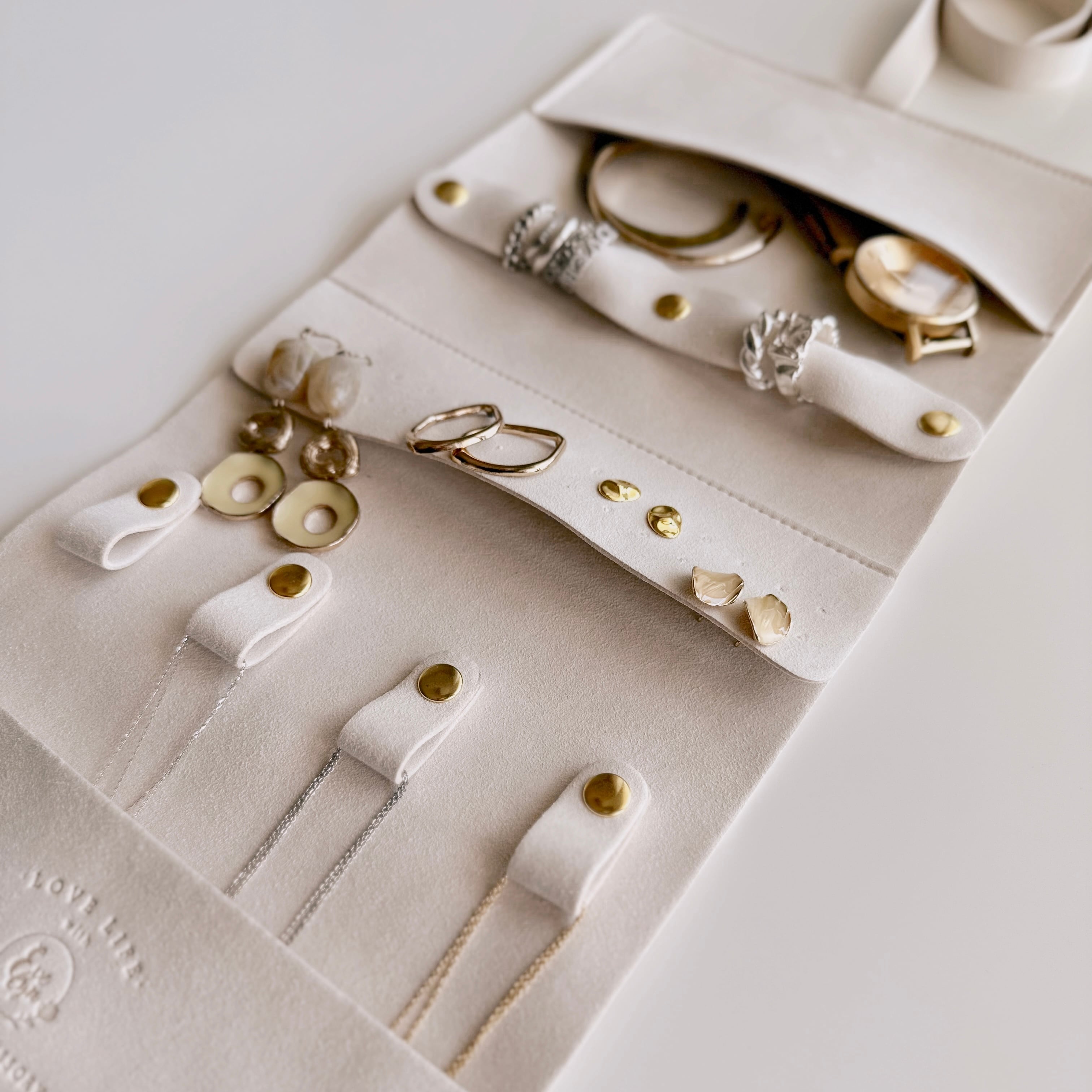 内側にはポケットやリング・ピアス・ネックレスの仕切りがあり、